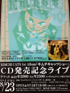 キムチキャッツLIVE情報♫ Event 2013.08.062025.10.26 「キムチキャッツ」ファン来たれ CD発売を記念して8/23カジノドライブでキムチキャッツショーがありますよ Open 19:00 出演/キムチキャッツ、バンバンバザール、藤井康一、他 場所/CASINO DRIVE 旭川市7条7丁目 前売り/2,000,- 当日/2,500,- 音楽でハッピーになろう♫
